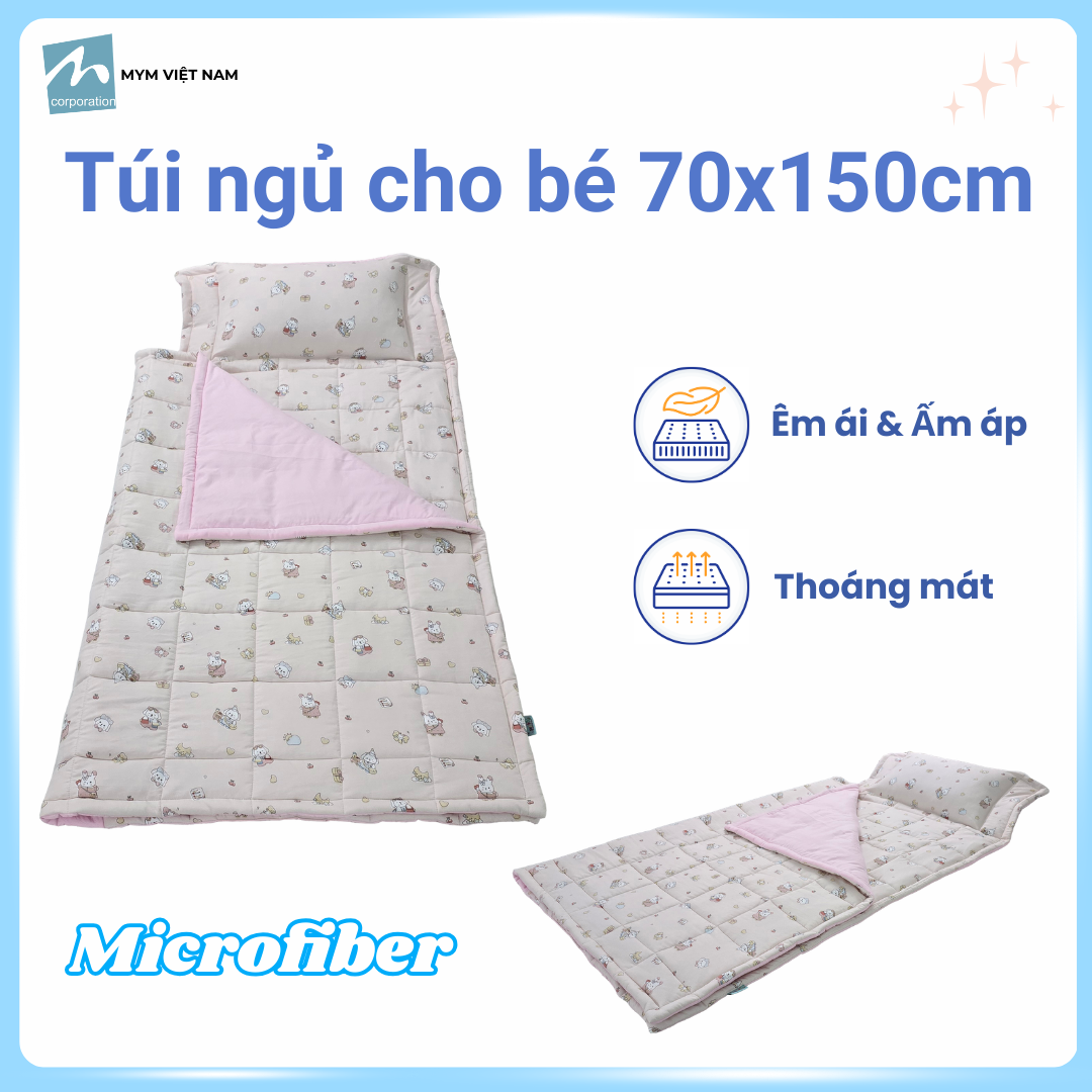 Ruột gối của túi ngủ sử dụng xơ microfiber mềm mại, tương tự như sợi lông vũ tự nhiên, nhưng có ưu điểm vượt trội hơn. Do được làm từ sợi polyester, ruột gối microfiber nhanh khô sau khi giặt và không bị vón cục. Điều này giúp giữ cho gối luôn mềm mại và thoải mái, đồng thời ngăn ngừa sự xuất hiện của các loại bọ ký sinh, đảm bảo an toàn tối đa cho trẻ. - Thiết Kế Thông Minh Kết Hợp Chăn Và Tấm Trải